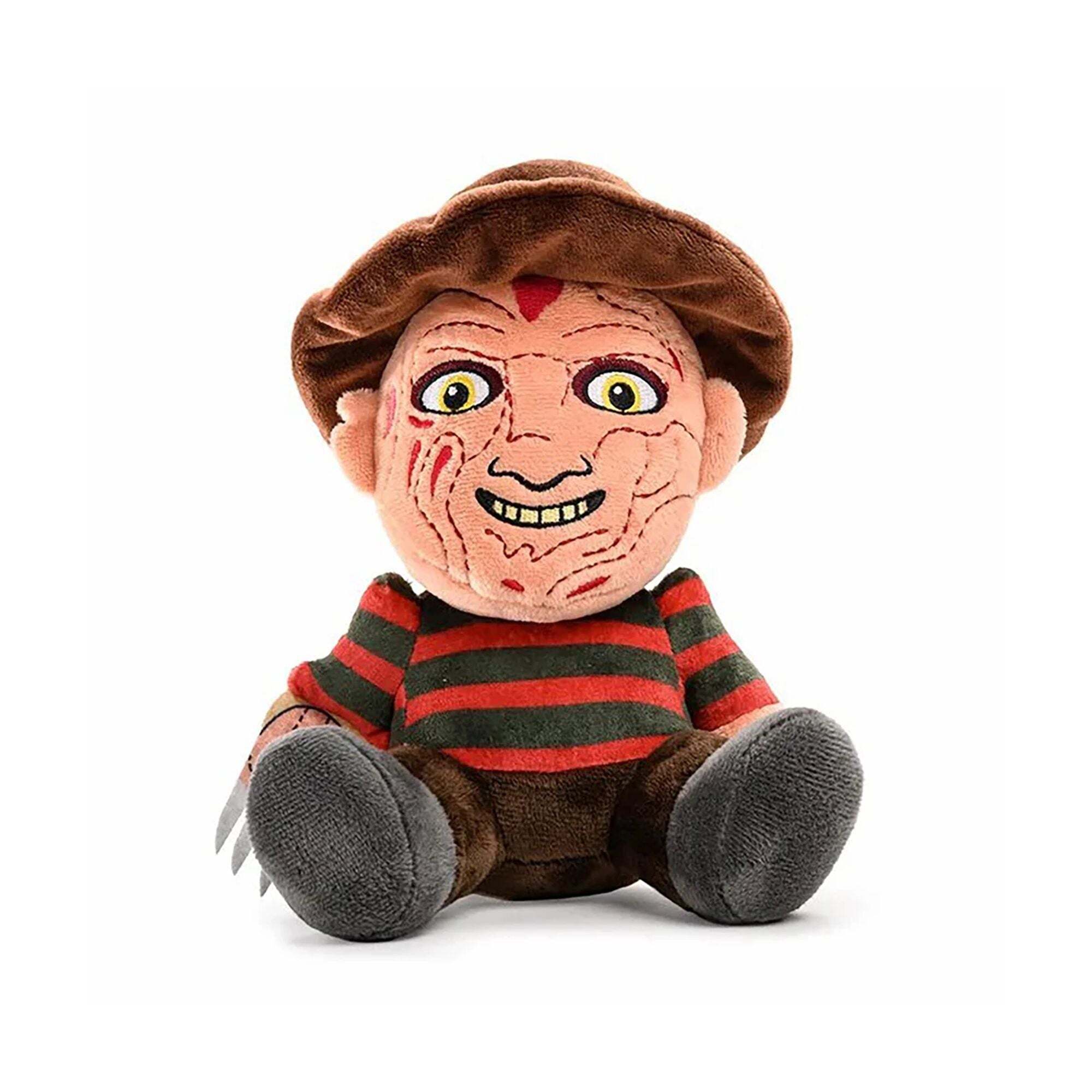 Lucha por mantenerte despierto abrazando a este icónico peluche de la película "Pesadilla en Elm Street", o enfréntate al aterrador y sorprendentemente suave Freddy Krueger. Con su cara quemada, su característico suéter a rayas y su guante con cuchillas, este peluche está listo para unirse a tu colección de peluches de terror. No apto para menores de 3 años (peligro de asfixia por piezas pequeñas). Altura: 20 cm