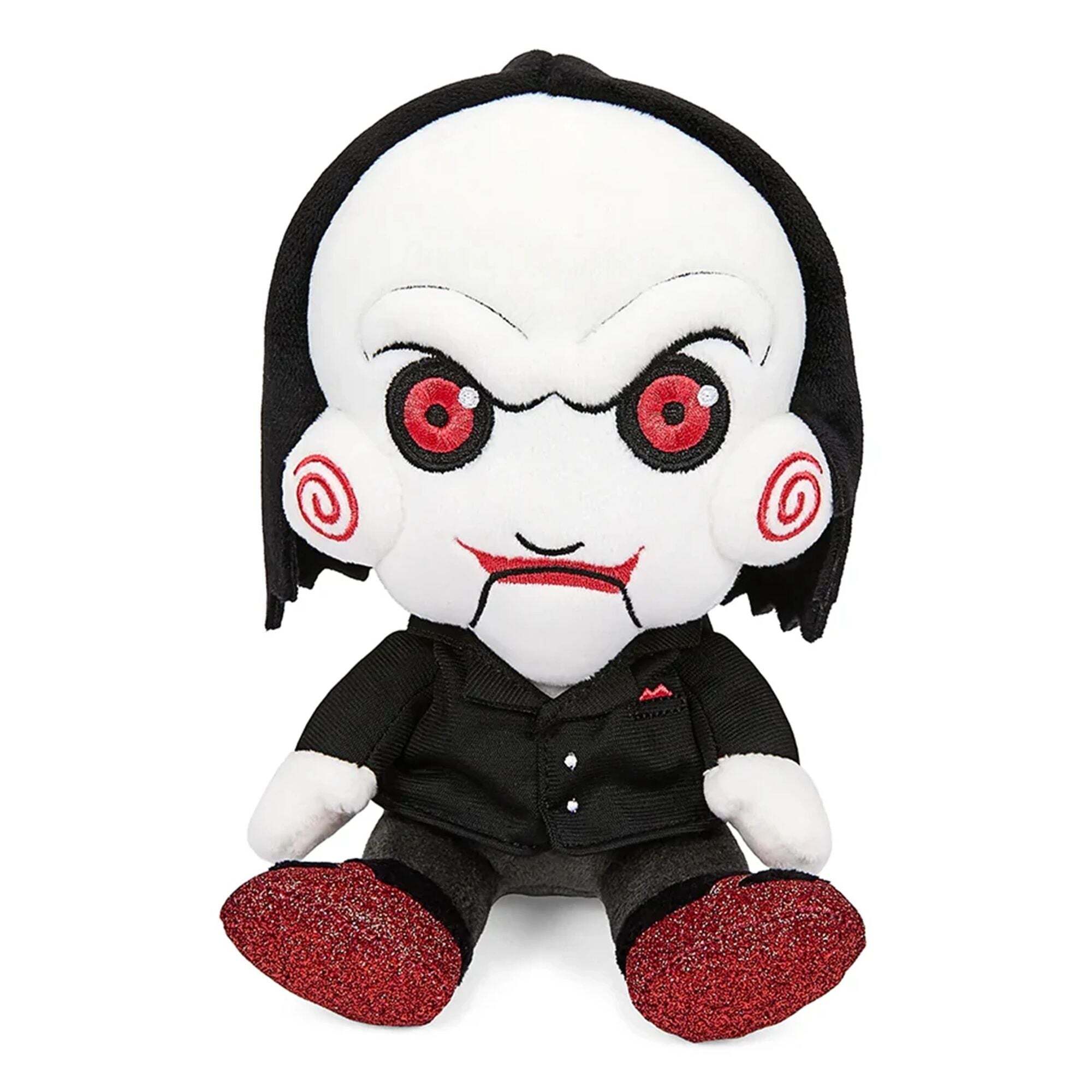 ¿Quieres jugar? ¡Pon a prueba tus habilidades de supervivencia con Billy el Títere! El pequeño y espeluznante mensajero de Jigsaw, de la saga Saw, nunca ha sido tan adorable. ¡Querrás abrazarlo fuerte! El peluche de Billy el Títere mide 20 cm y luce su icónico disfraz. (¡Y con zapatos brillantes, además!). No apto para menores de 3 años (peligro de asfixia por piezas pequeñas). Altura: 20 cm.