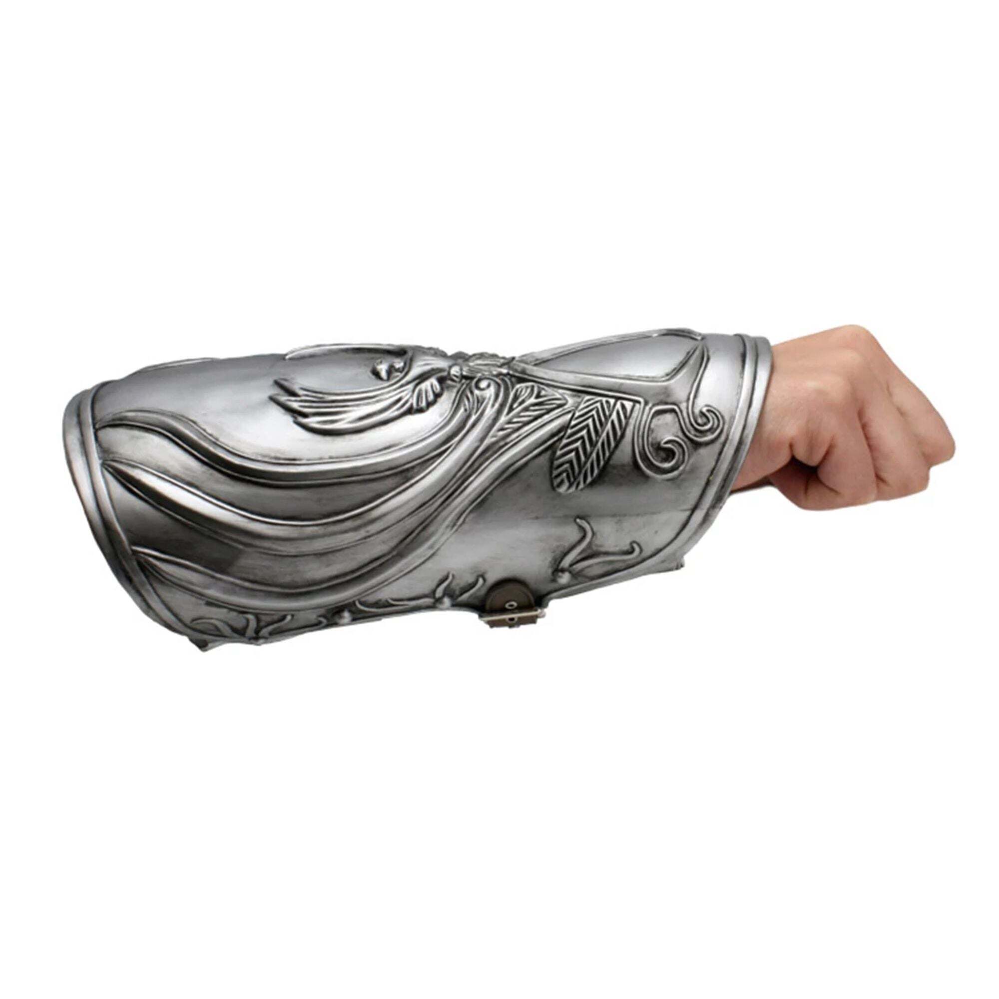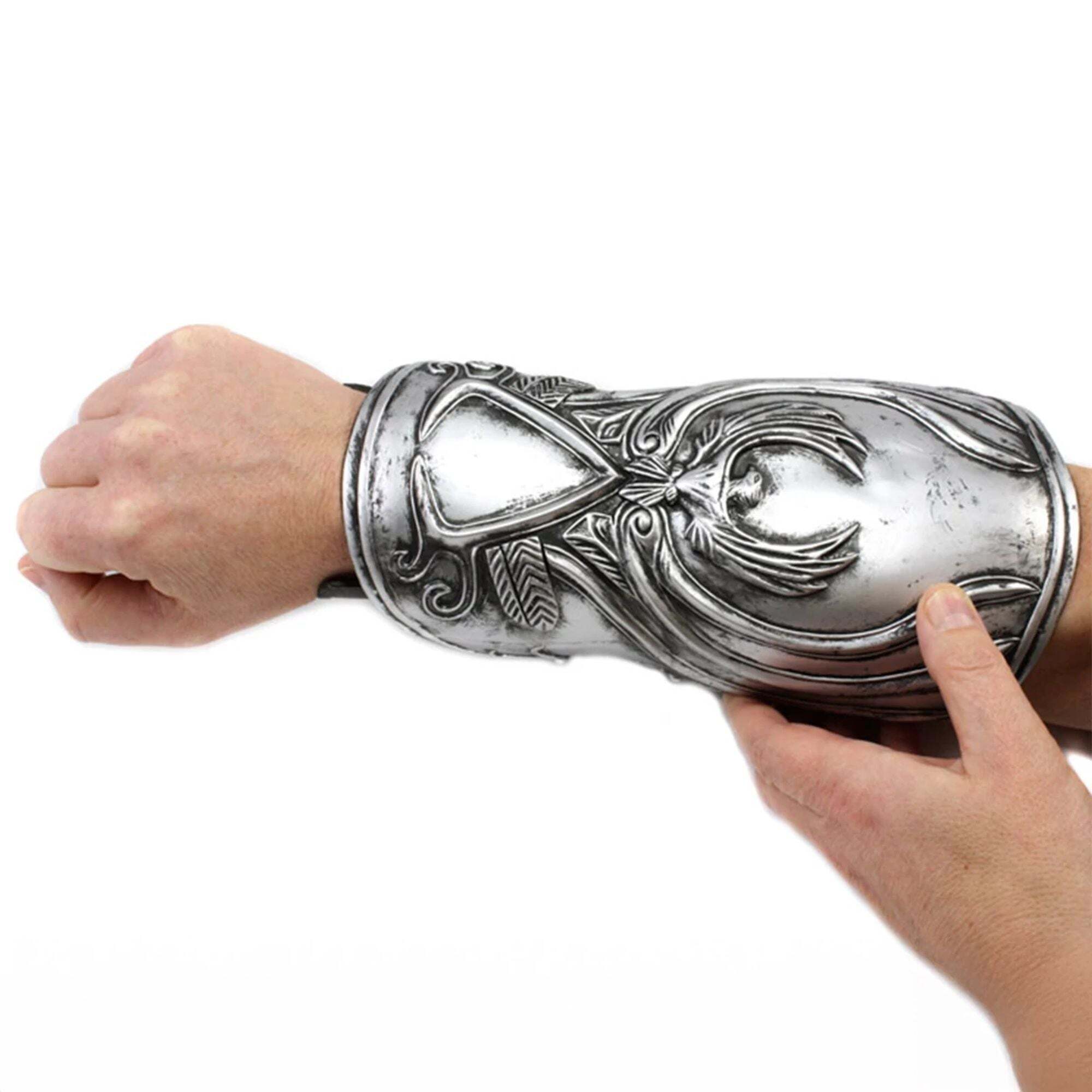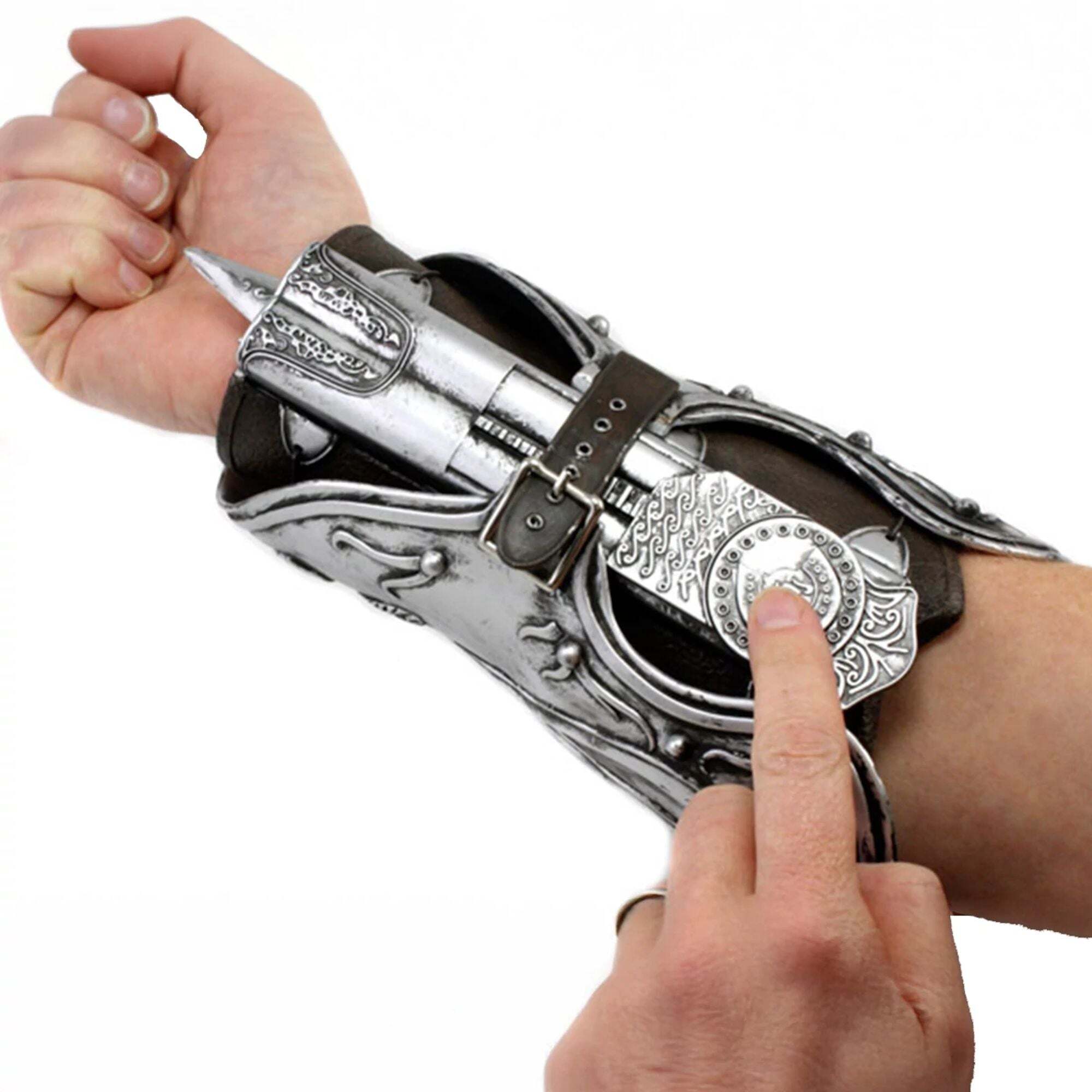 Esta réplica del guantelete de Assassin's Creed es de lo más realista. Forma parte de la vestimenta de Ezio Auditore y recrea a la perfección el guantelete de la serie Assassin's Creed. Además de la belleza del brazalete, cuenta con un mecanismo de resorte y una hoja de goma. El guantelete de Ezio consta de dos partes: el protector exterior de la muñeca y la muñequera interior (donde se encuentra el mecanismo de resorte). Es de talla única, con correas ajustables para adaptarse a casi cualquier antebrazo: Protector interior de la muñeca: 11,4 cm; antebrazo: 5 cm; protector exterior de la muñeca: 10 4 . Altura: 18cm