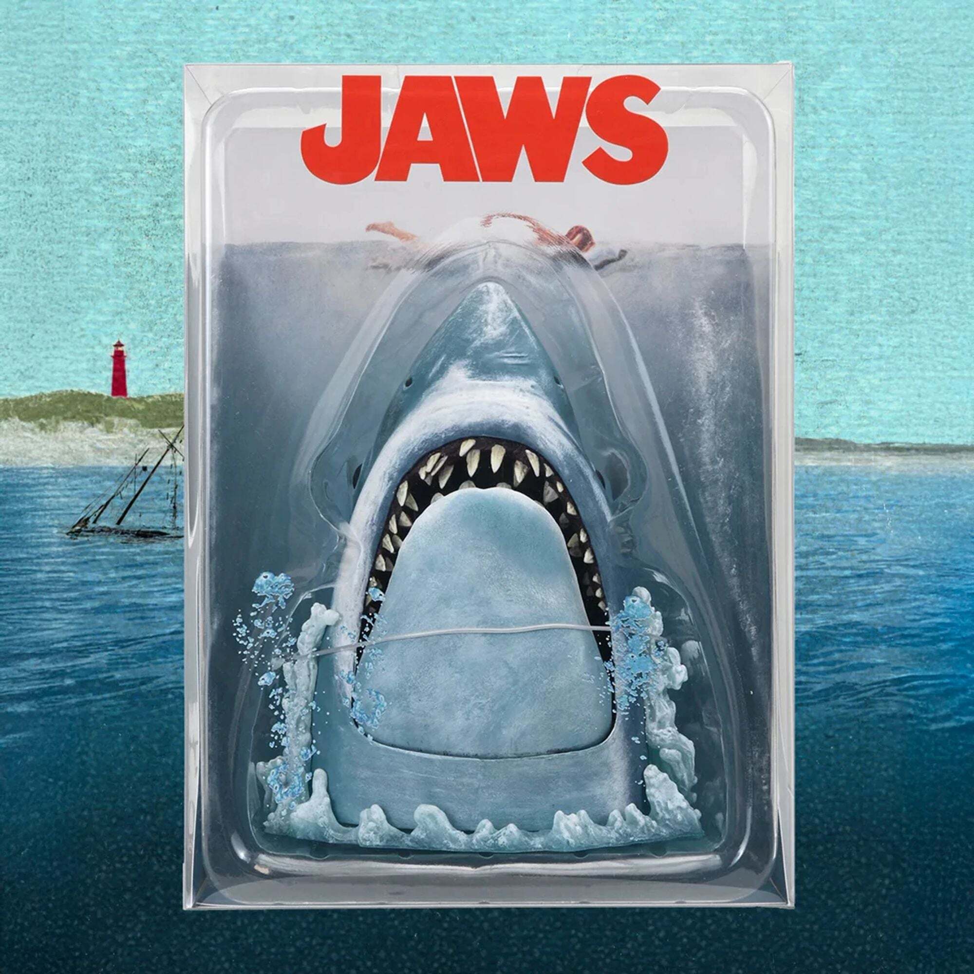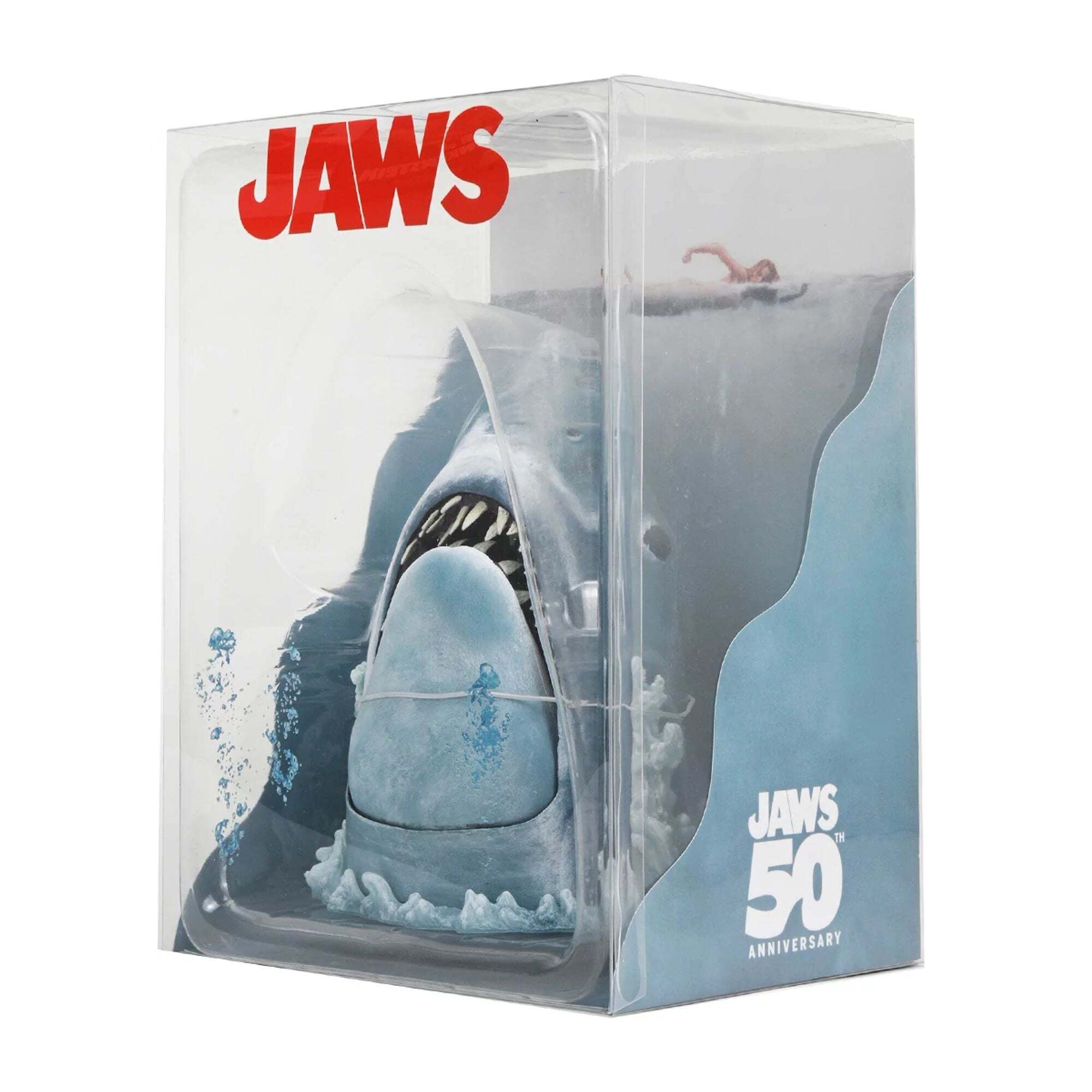 Para celebrar el 50.º aniversario de la obra maestra cinematográfica Tiburón, NECA lanza una impresionante pieza de colección: una recreación en 3D del icónico póster de la película. Esta figura captura fielmente al aterrador tiburón mako de Roger Kastel, con un intrincado esculpido y una mandíbula articulada. Montado sobre una base acuática con efectos esculpidos de olas y burbujas, el tiburón parece emerger de las profundidades para atacar. El set viene en un empaque transparente con un inserto de fondo inspirado en el póster original. Una creación única que combina arte y cine.