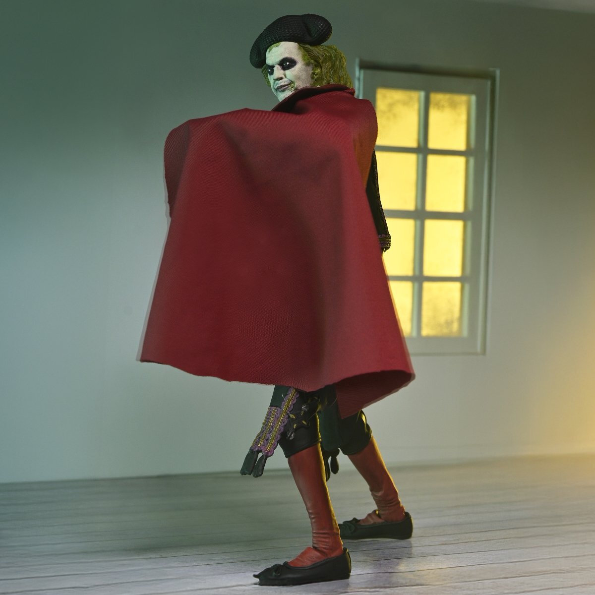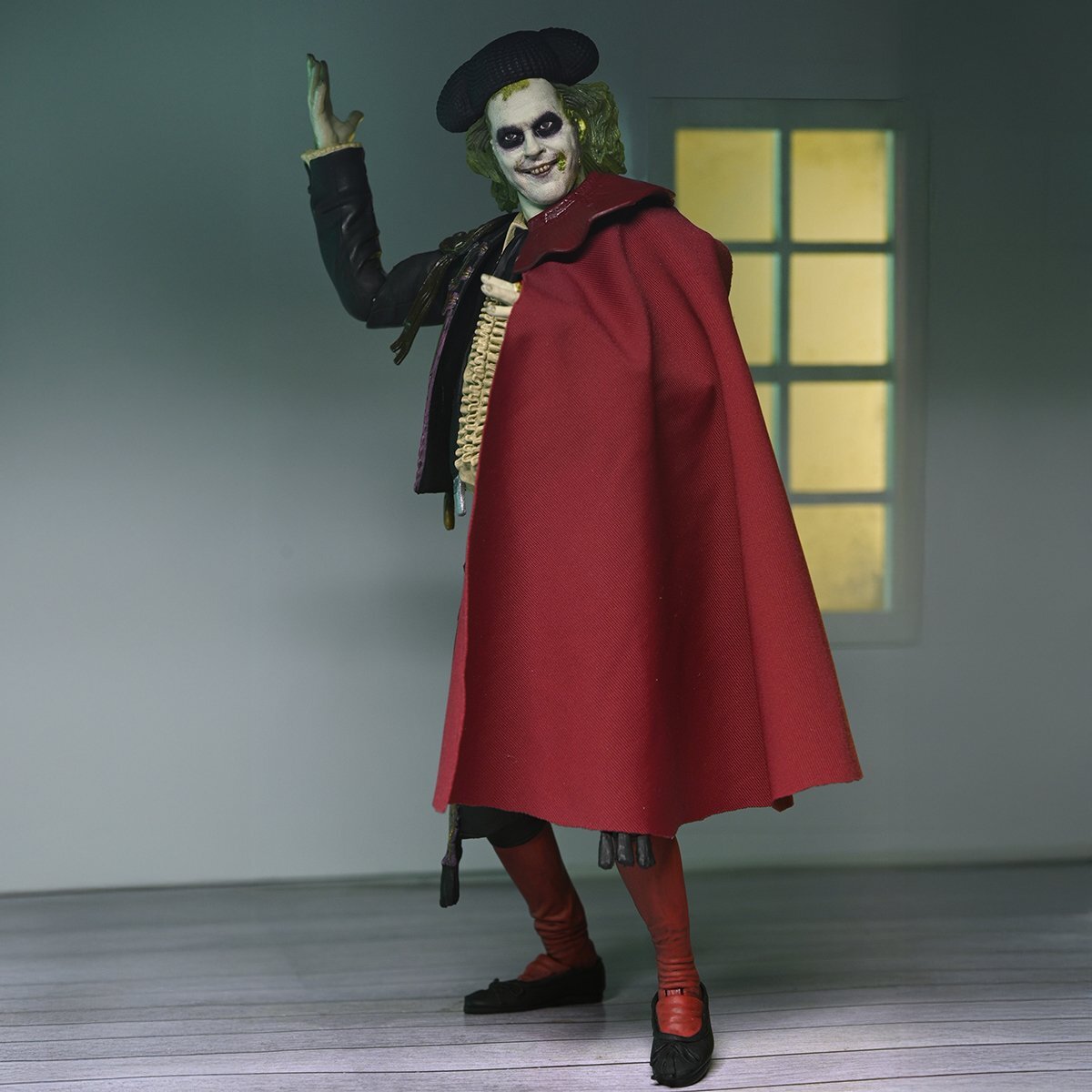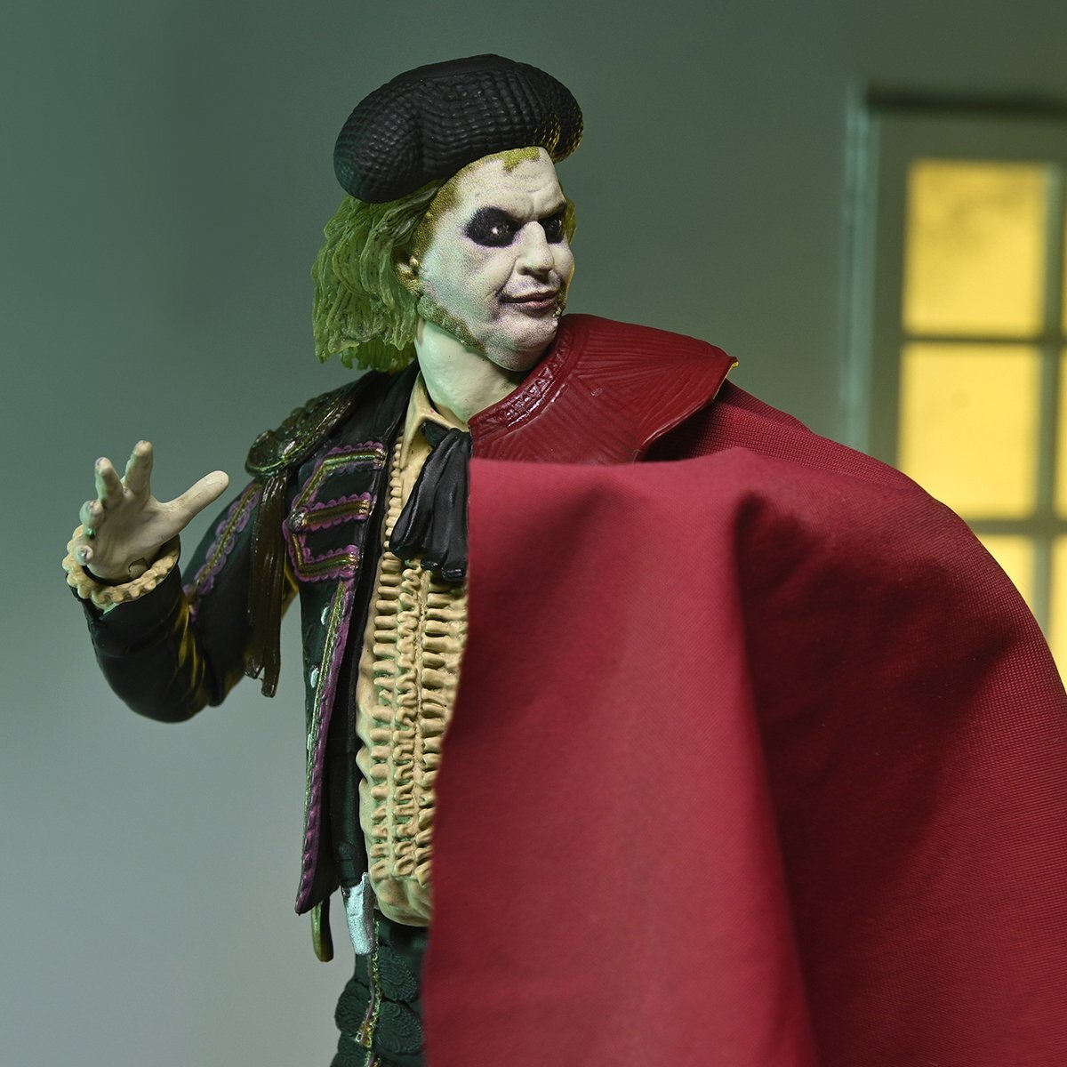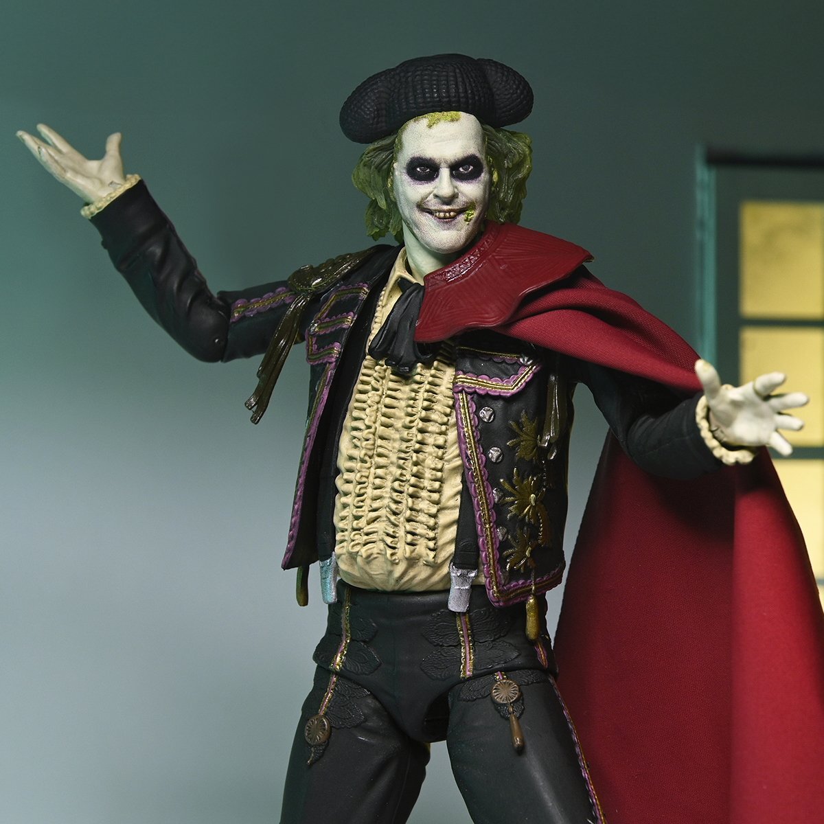 ¡El fantasma más famoso ha vuelto! De la secuela de Tim Burton de 2024, Beetlejuice, el infame bioexorcista regresa una vez más para manipular a Lydia para que se case con él y finalmente escape del más allá. Durante la boda, su siniestro plan se ve frustrado cuando la hija de Lydia, Astrid, invoca un gusano de arena al mundo de los vivos para detenerlo. Beetlejuice se transforma rápidamente en un matador para distraer al monstruoso gusano de arena y que este se trague a su exesposa. ¡NECA da vida al caos de esta icónica escena! Altura: 18cm
