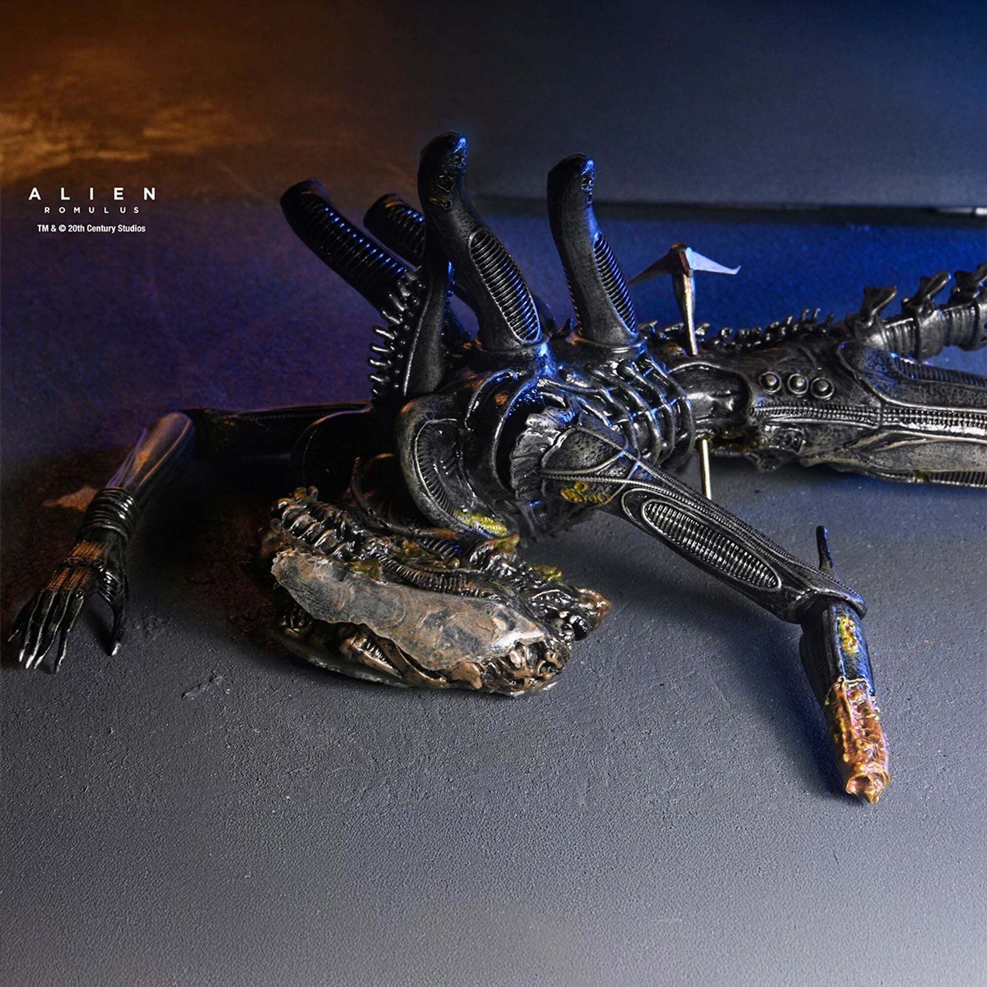 Una edición de coleccionista inspirada en la exitosa película de Fede Alvarez de 2024. Directamente del aterrador nuevo capítulo de la saga Alien, Alien: Romulus, ¡el legendario Xenomorfo regresa en una espectacular edición de coleccionista! Tras un sangriento enfrentamiento con las fuerzas de seguridad de Weyland-Yutani, la criatura alienígena es encontrada suspendida en el laboratorio de la nave... Su sangre ácida, quemando el suelo, dio a los científicos acceso directo al ADN de la máquina de matar perfecta. Esta figura de lujo de NECA recrea esta escena icónica: el Xenomorfo mutilado suspendido por cables articulados para un efecto de levitación realista. Incluye un elemento de decoración de pared que representa el techo del laboratorio manchado de ácido: fíjelo a la pared o al techo para una exhibición dinámica. Los detalles ultrarrealistas incluyen una mandíbula articulada, una mandíbula interior deslizante y una cola reforzada con alambre para una variedad de poses. Todo presentado en una caja de exhibición transparente para coleccionistas, perfecta para exhibir esta pieza central de tu colección Alien: Romulus. Altura: 18cm