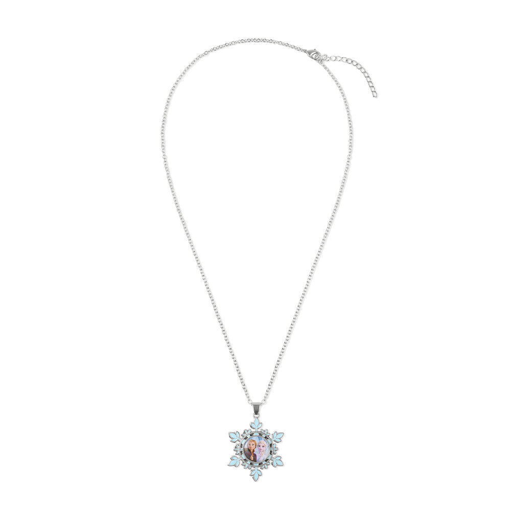 El collar bañado en plata esterlina se complementa con el diseño colgante de las adorables Elsa y Anna dentro del icónico diseño de copo de nieve.