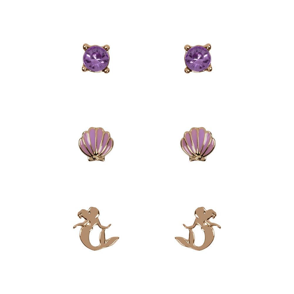 El pack de pendientes incluye un par de pendientes con piedras moradas, concha morada y diseño de Ariel dorado.