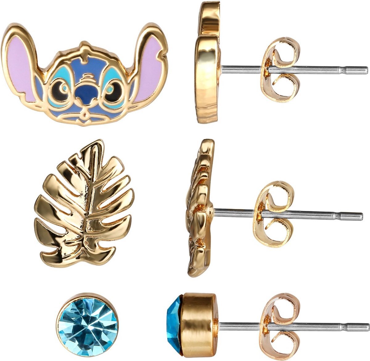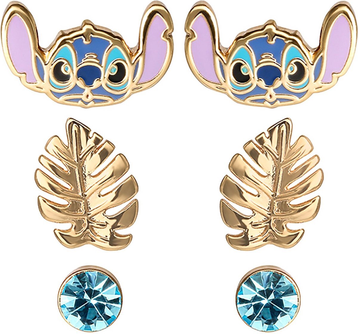 El pack de pendientes incluye pendientes Stitch rellenos de esmalte de colores, pendientes de pan de oro y pendientes con piedras azules.