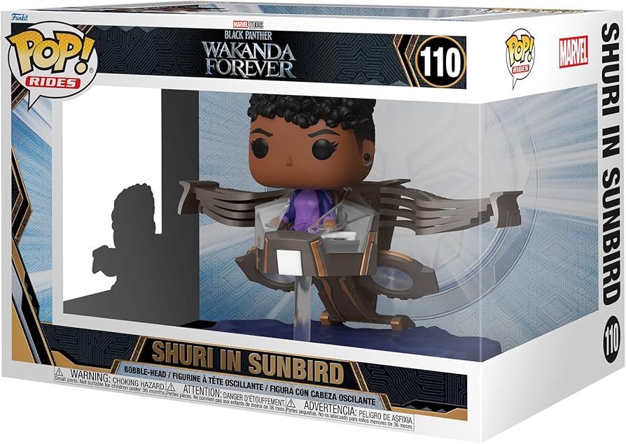 Figura Pop Marvel Pantera Negra: Shuri en Sunbird. Mide 15 cm. Producto presentado en caja expositora.